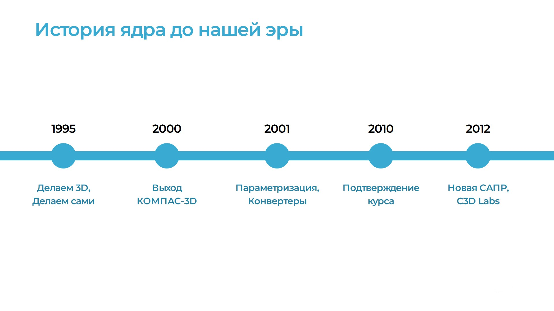 История платформы делится на два этапа (рис. 1). Первый связан с развитием C3D как математического ядра КОМПАС-3D. В 1995 году в АСКОН приняли решение о старте разработки собственной трехмерной САПР. К 2000 году вышла первая версия КОМПАС-3D, целиком основанная на собственной математике. С этого момента геометрическое ядро стало активно развиваться, учитывая потребности пользователей.