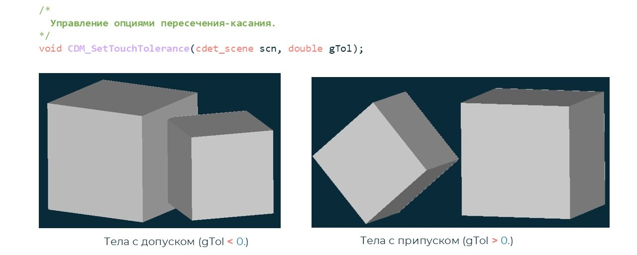 По запросам пользователей реализована функция SetTouchTolerance, позволяющая классифицировать незначительные пересечения как касания. В этом случае такие ситуации не рассматриваются детектором как пересечения. Для интерпретации пересечения как касания задается отрицательная толерантность. Слева на рис. 5 показан случай, когда два тела пересекаются, но при заданной толерантности результатом считается касание. Справа же пересечения нет. Если при этом необходимо зафиксировать касание, задается положительная толерантность. Этот вариант используется реже, но он также поддерживается.