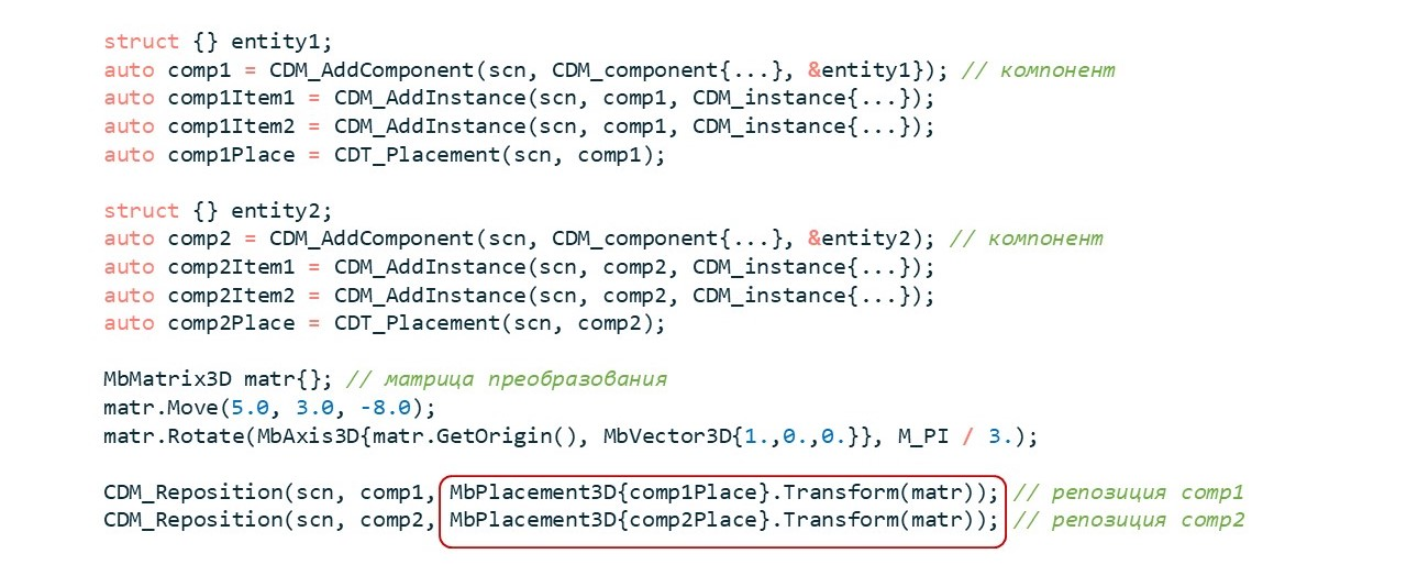 В функциональном API было введено два вспомогательных типа. Это CDM_component, который позволяет добавить в сцену компонент с определенным положением в глобальной системе координат сцены (рис. 2). Другой тип — CDM_instance, который позволяет добавить экземпляр MbItem со своим положением относительно либо компонента, либо глобальной системы координат сцены.