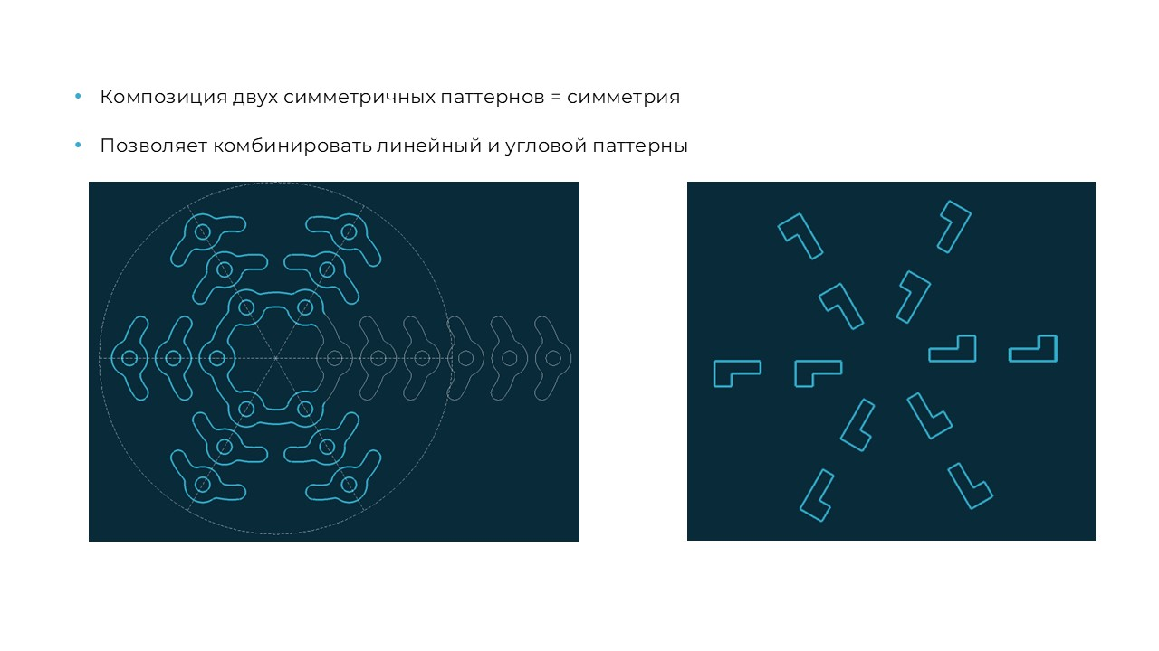 Также развитие получил функционал паттернов: была реализована поддержка композиционных паттернов, связывающих геометрические объекты двумя закономерностями одновременно. Новый тип паттернов представляет собой систему ограничений, позволяющую, например, создавать концентрические структуры сочетанием линейного и углового паттернов (Рис. 2). Концептуально это сводится к алгебраическому описанию: над образцом производится серия преобразований — i раз в одном направлении, j раз в другом — результатом становится нужный экземпляр. Таким образом, два базовых паттерна объединяются в композиционный, формирующий особую структуру копий объекта.